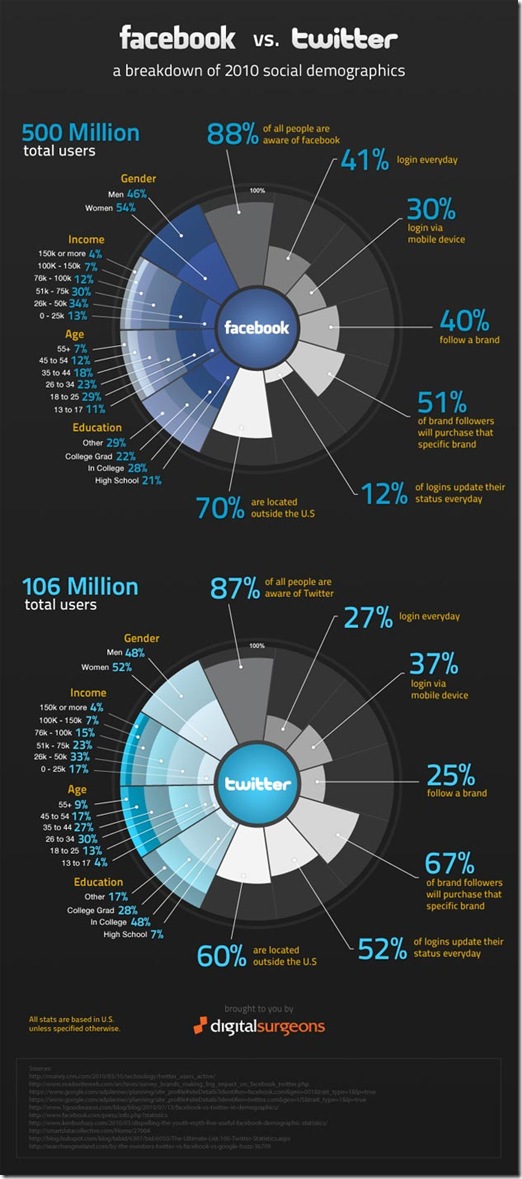 Jedna od statistika koju bi vlasnici tvrtki mogu pogledaju i da analiziraju a koja bi im sigurno mogla pružiti bolji uvid i pomoć pri vrednovanju nekih od varijabli je svakako infografika tvrtke Digital Surgeons koja prikazuje socijalnu demografiju Facebook-a u odnosu na Twitter za 2010 godinu: